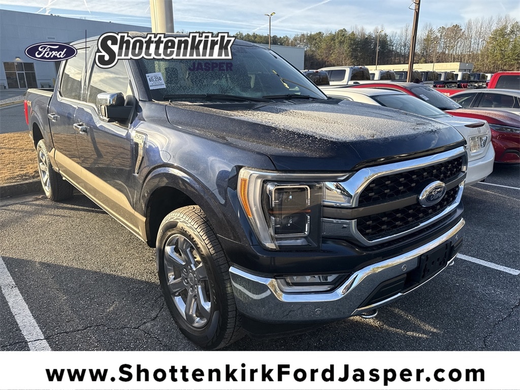 **One Owner**, **Clean Carfax**, **Low Mileage**, Twin Panel Moonroof, **Power Sunroof/Moonroof**, **Leather interior**, **Heated/Cooled Seats**, **Heated Seats, **Front bucket seats with center console**, Apple car play/ Android auto, **Ford Sync Bluetooth**, **Bluetooth/Hands Free**, **Rear back up camera**, **Reverse Sensing System**, **Blind Spot Detection**, **Lane monitor**, **GPS/ Navigation**, **Power liftgate**, **Remote start**, Power running boards, **SIRIUS SAT. RADIO**, Forward collison/adaptive cruise control, and B&O sound system Bed Utility Package (BoxLink, LED Box Lighting, Power Tailgate, and Tailgate Step w/Tailgate Work Surface), Equipment Group 601A High (Power-Deployable Running Boards and Radio: B&O Unleashed Sound System by Bang & Olufsen), GVWR: 7,050 lbs Payload Package, King Ranch Chrome Appearance Package (Bright Belt Moldings, Chrome Door Handles w/Body-Color Strap, Chrome Skull Caps on Exterior Mirrors, and Wheels: 20" Chrome-Like PVD), Trailer Tow Package (Class IV Trailer Hitch Receiver, Integrated Trailer Brake Controller, and Pro Trailer Backup Assist & Pro Trailer Hitch Assist), 4-Wheel Disc Brakes, 8 Speakers, ABS brakes, Adjustable pedals, Air Conditioning, AM/FM radio: SiriusXM with 360L, Auto High-beam Headlights, Auto tilt-away steering wheel, Auto-dimming door mirrors, Auto-dimming Rear-View mirror, Automatic temperature control, Brake assist, Compass, Delay-off headlights, Driver door bin, Driver vanity mirror, Dual front impact airbags, Dual front side impact airbags, Electronic Locking w/3.31 Axle Ratio, Electronic Stability Control, Emergency communication system: SYNC 4 911 Assist, Extended Range 36 Gallon Fuel Tank, Exterior Parking Camera Rear, Front anti-roll bar, Front Bucket Seats, Front Center Armrest, Front dual zone A/C, Front fog lights, Front reading lights, Front wheel independent suspension, Fully automatic headlights, Garage door transmitter, Genuine wood console insert, Genuine wood dashboard insert, Genuine wood door panel insert, Heated door mirrors, Heated front seats, Heated rear seats, Heated steering wheel, Illuminated entry, Inclination/Intrusion Sensor Removal, King Ranch Leather Bucket Seats, LED Sideview Mirror Spotlights, Low tire pressure warning, Memory seat, Multicontour Seats w/Active Motion Removal, Occupant sensing airbag, Outside temperature display, Overhead airbag, Overhead console, Panic alarm, Passenger door bin, Passenger vanity mirror, Pedal memory, Power door mirrors, Power driver seat, Power passenger seat, Power steering, Power windows, Radio data system, Radio: B&O Sound System by Bang & Olufsen, Rain sensing wipers, Rear reading lights, Rear seat center armrest, Rear step bumper, Rear window defroster, Remote keyless entry, Security system, Speed control, Speed-sensing steering, Split folding rear seat, Steering wheel memory, Steering wheel mounted audio controls, SYNC 4 w/Enhanced Voice Recognition, Tachometer, Telescoping steering wheel, Tilt steering wheel, Traction control, Trip computer, Turn signal indicator mirrors, Twin Panel Moonroof, Variably intermittent wipers, Ventilated front seats, Voltmeter, and Wheel Well Liner Shottenkirk Ford of Jasper is pleased to offer you this exceptional 2023 Ford F-150. This King Ranch F-150 Exterior is finished in Antimatter Blue Metallic and the interior is finished in Java w/King Ranch Leather Bucket Seats. Clean CARFAX.