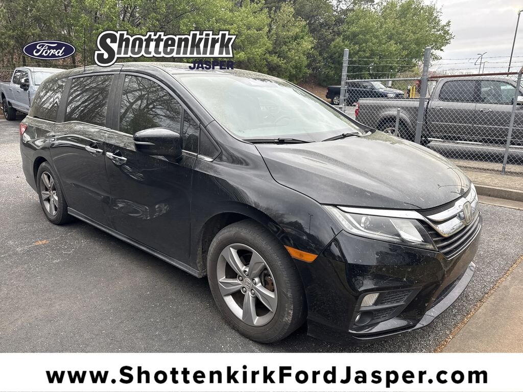 **Local Trade In**, **Power Sunroof/Moonroof**, **Leather interior**, **Heated Seats, **Front bucket seats with center console**, **Bluetooth/Hands Free**, **Rear back up camera**, **Reverse Sensing System**, **Blind Spot Detection**, **Lane monitor**, **GPS/ Navigation**, **New tires**, **Power liftgate**, **Power windows and locks**, **Remote start**, and **SIRIUS SAT. RADIO** 3rd row seats: split-bench, 4-Wheel Disc Brakes, 4.33 Axle Ratio, 7 Speakers, ABS brakes, Air Conditioning, Alloy wheels, AM/FM radio: SiriusXM, Anti-whiplash front head restraints, Apple CarPlay/Android Auto, Auto High-beam Headlights, Auto-dimming Rear-View mirror, Automatic temperature control, Blind Spot Information (BSI) System warning, Brake assist, Bumpers: body-color, Delay-off headlights, Driver door bin, Driver vanity mirror, Driver's Seat Mounted Armrest, Dual front impact airbags, Dual front side impact airbags, Electronic Stability Control, Emergency communication system: HondaLink, Exterior Parking Camera Rear, Four wheel independent suspension, Front anti-roll bar, Front Bucket Seats, Front dual zone A/C, Front fog lights, Front reading lights, Fully automatic headlights, Garage door transmitter: HomeLink, Heated door mirrors, Heated Front Bucket Seats, Heated front seats, Illuminated entry, Knee airbag, Leather Seat Trim, Leather steering wheel, Low tire pressure warning, Memory seat, Occupant sensing airbag, Outside temperature display, Overhead airbag, Overhead console, Panic alarm, Passenger door bin, Passenger seat mounted armrest, Passenger vanity mirror, Power door mirrors, Power driver seat, Power Liftgate, Power moonroof, Power passenger seat, Power steering, Power windows, Radio data system, Radio: 160-Watt AM/FM/HD/SiriusXM Audio System, Rear air conditioning, Rear anti-roll bar, Rear reading lights, Rear seat center armrest, Rear window defroster, Rear window wiper, Reclining 3rd row seat, Remote keyless entry, Security system, Speed control, Speed-sensing steering, Speed-Sensitive Wipers, Split folding rear seat, Spoiler, Steering wheel mounted audio controls, Tachometer, Telescoping steering wheel, Tilt steering wheel, Traction control, Trip computer, Turn signal indicator mirrors, Variably intermittent wipers, and Wheels: 18" Silver-Painted Alloy Shottenkirk Ford of Jasper is pleased to offer you this exceptional 2018 Honda Odyssey. This EX-L Odyssey Exterior is finished in Crystal Black Pearl and the interior is finished in Gray w/Leather Seat Trim. 19/28 City/Highway MPG