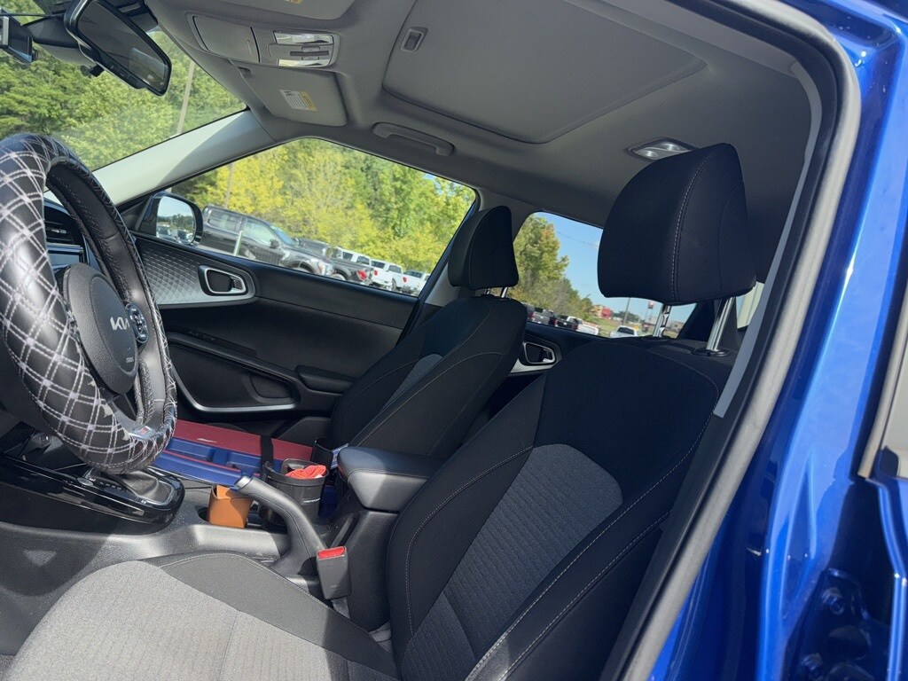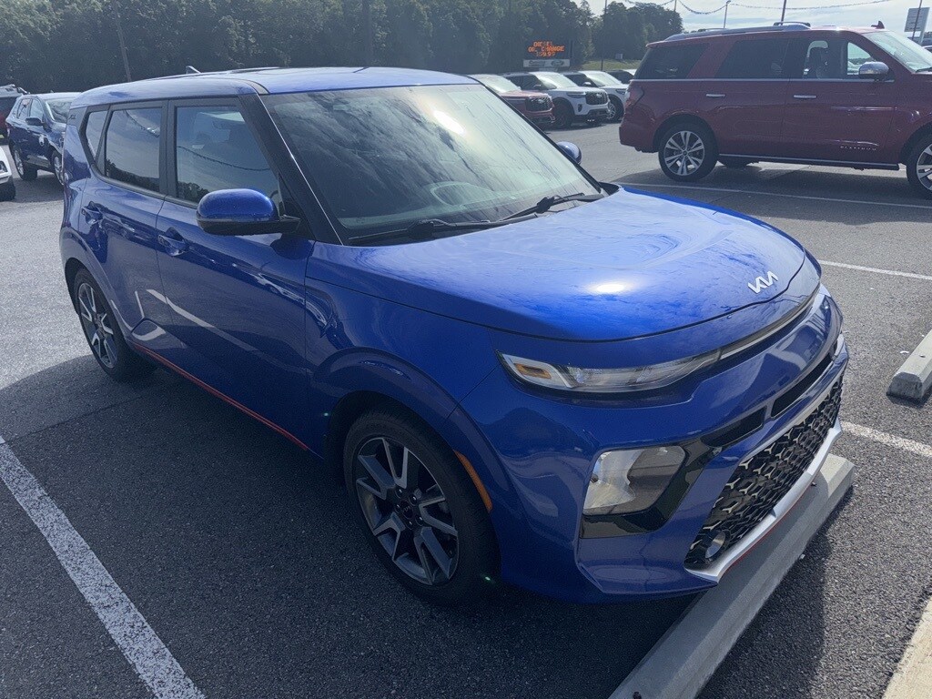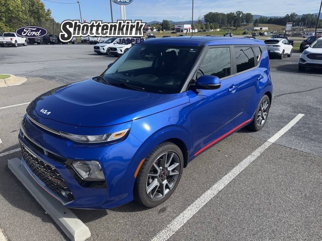 **Local Trade In**, **One Owner**, **Clean Carfax**, **Low Mileage**, **Front bucket seats with center console**, **Bluetooth/Hands Free**, **Rear back up camera**, **Reverse Sensing System**, **Blind Spot Detection**, **Lane monitor**, and **SIRIUS SAT. RADIO** 18" x 7.5" Alloy Wheels, 4-Wheel Disc Brakes, 6 Speakers, ABS brakes, Air Conditioning, Alloy wheels, AM/FM radio: SiriusXM, Apple CarPlay & Android Auto, Automatic temperature control, Brake assist, Bumpers: body-color, Carpeted Floor Mats, Delay-off headlights, Driver door bin, Driver vanity mirror, Dual front impact airbags, Dual front side impact airbags, Electronic Stability Control, Emergency communication system: UVO Link, Exterior Parking Camera Rear, Front anti-roll bar, Front Bucket Seats, Front Center Armrest, Front dual zone A/C, Front fog lights, Front reading lights, Front wheel independent suspension, Fully automatic headlights, Illuminated entry, Interior Light Kit, Leather Shift Knob, Leather steering wheel, Low tire pressure warning, Navigation System, Occupant sensing airbag, Outside temperature display, Overhead airbag, Overhead console, Panic alarm, Passenger door bin, Passenger vanity mirror, Power moonroof, Power steering, Power windows, Premium Cloth Seat Trim, Radio: AM/FM/MP3 Audio System, Rear Bumper Applique Turbo, Rear window defroster, Rear window wiper, Remote keyless entry, Speed control, Speed-sensing steering, Split folding rear seat, Steering wheel mounted audio controls, Tachometer, Telescoping steering wheel, Tilt steering wheel, Traction control, Trip computer, Turn signal indicator mirrors, and Variably intermittent wipers Shottenkirk Ford of Jasper is pleased to offer you this exceptional 2022 Kia Soul. This GT-Line Soul Exterior is finished in Neptune Blue and the interior is finished in Black w/Premium Cloth Seat Trim. CARFAX One-Owner. Clean CARFAX. 28/33 City/Highway MPG