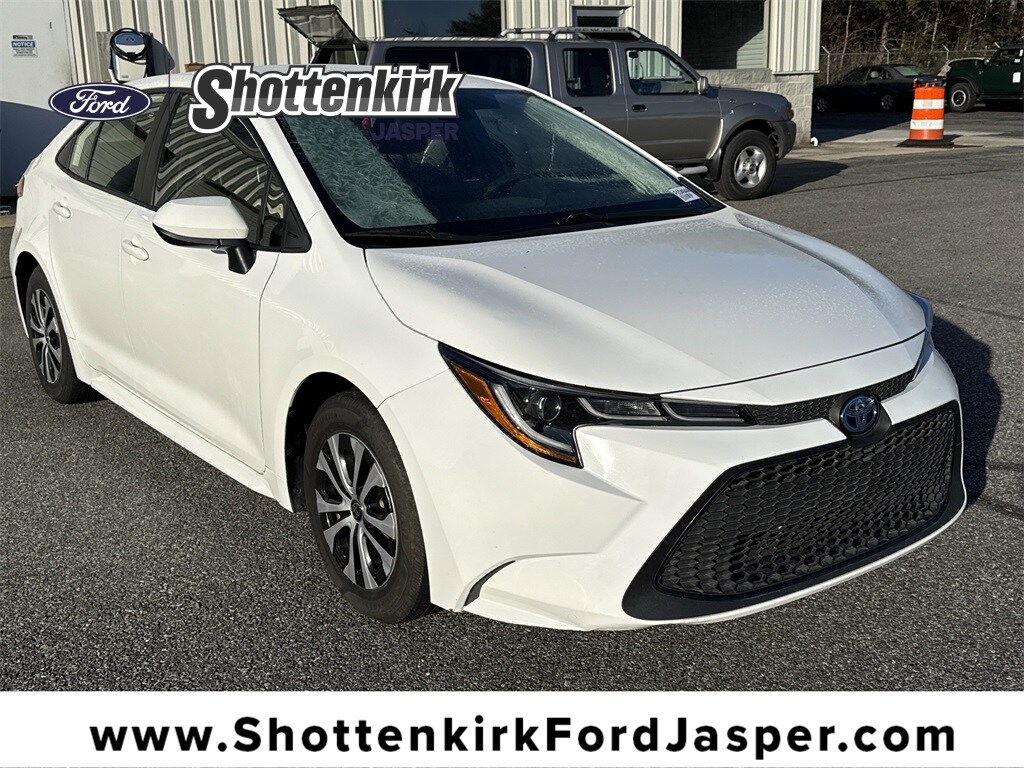 **Local Trade In**, **One Owner**, **Clean Carfax**, **Front bucket seats with center console**, **Bluetooth/Hands Free**, **Rear back up camera**, **Reverse Sensing System**, **Blind Spot Detection**, **Lane monitor**, and **SIRIUS SAT. RADIO** 4-Wheel Disc Brakes, 6 Speakers, ABS brakes, Air Conditioning, Alloy wheels, AM/FM radio: SiriusXM, Apple CarPlay/Android Auto, Auto High-beam Headlights, Automatic temperature control, Brake assist, Bumpers: body-color, Delay-off headlights, Driver door bin, Driver vanity mirror, Dual front impact airbags, Dual front side impact airbags, Electronic Stability Control, Emergency communication system: Safety Connect with 1-year trial, Exterior Parking Camera Rear, Four wheel independent suspension, Front anti-roll bar, Front Bucket Seats, Front Center Armrest, Front reading lights, Fully automatic headlights, Heated door mirrors, Illuminated entry, Knee airbag, Low tire pressure warning, Occupant sensing airbag, Outside temperature display, Overhead airbag, Panic alarm, Passenger door bin, Passenger vanity mirror, Power door mirrors, Power steering, Power windows, Premium Fabric Seat Trim, Radio data system, Radio: Audio AM/FM, Rear anti-roll bar, Rear seat center armrest, Rear side impact airbag, Rear window defroster, Remote keyless entry, Security system, Speed control, Split folding rear seat, Steering wheel mounted audio controls, Tachometer, Telescoping steering wheel, Tilt steering wheel, Traction control, Trip computer, Variably intermittent wipers, and Wheels: 15" Alloy w/Cover Shottenkirk Ford of Jasper is pleased to offer you this exceptional 2022 Toyota Corolla Hybrid. This LE Corolla Hybrid Exterior is finished in White and the interior is finished in Black w/Premium Fabric Seat Trim or SofTex Leather Seat Trim. CARFAX One-Owner. Clean CARFAX. 53/52 City/Highway MPG
